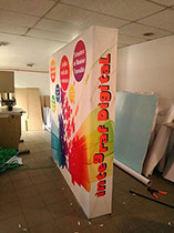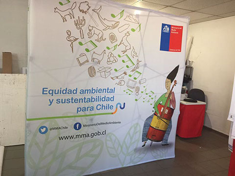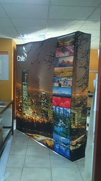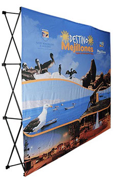 La estructura araña se abre y se cierra fácilmente por una persona y se asegura por medio de clips. La tela impresa ya está fijada con velcro a la estructura. Gráfica se encuentra montada en estructura, lista para usar, no requiere ser montada. Panel araña impreso en tela textil en alta resolución, Con colores vivos. Impresión amigable al medioambiente, no usa solventes.